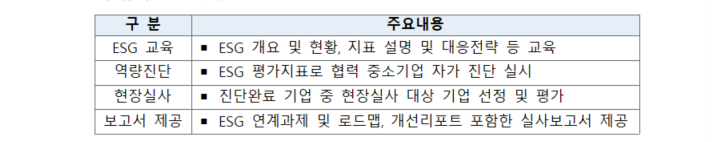 ◦ 전문 수행기관(한국표준협회)를 통하여 협력 중소기업의 ESG 대응역량 강화를 위한 ESG 교육 및 현장실사(컨설팅), 평가, ESG 정보공시 등을 종합적으로 지원