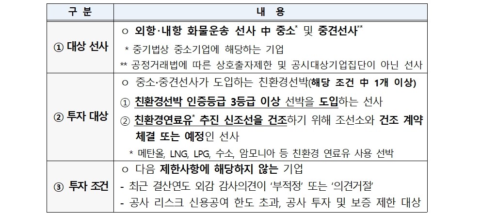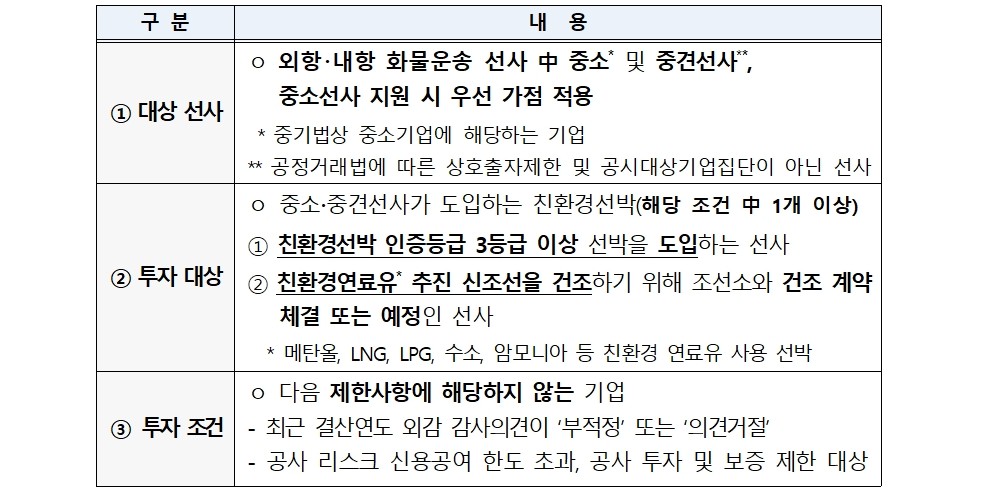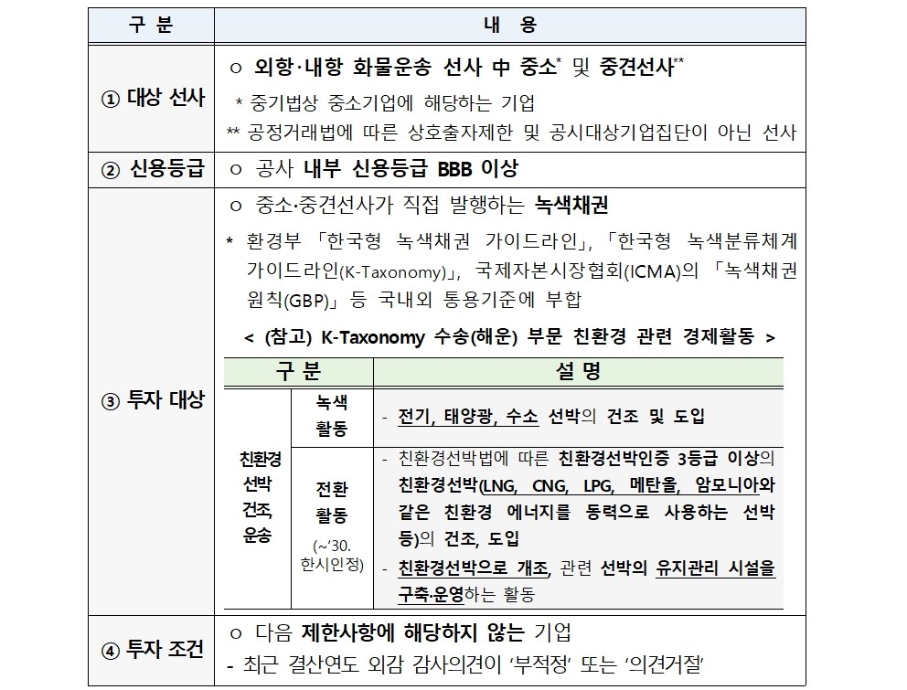 ㅇ 국적 해운사의 친환경 대응 역량 강화 및 친환경 자금조달 지원을 위해 중소·중견선사의 녹색채권 발행 및 중소선사의 친환경선박 도입 지원