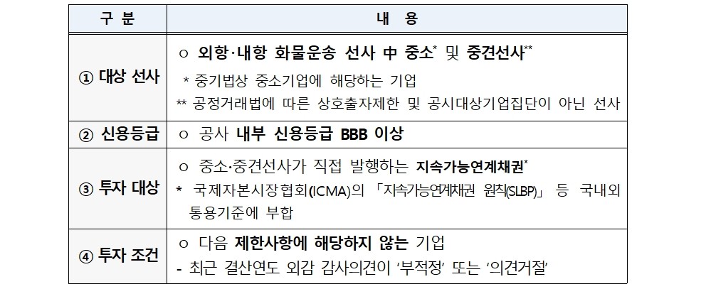 ㅇ (지원 내용) 해운사 발행 3년물 지속가능연계채권을 프로젝트 펀드 통해 인수, 지속가능연계채권 금리 산정 시 해운사가 설정하는 지속가능성과목표(SPT)에 따라 선사 신용등급별 할인율 적용