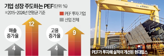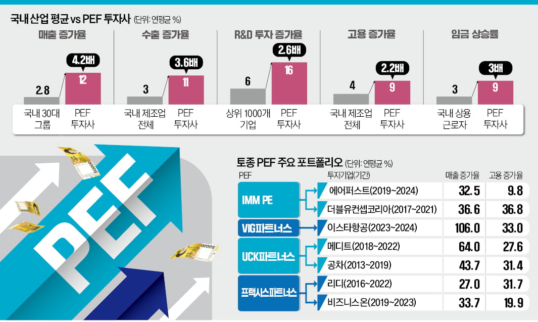 12일 글로벌 컨설팅업체 베인앤드컴퍼니가 2015년부터 10년 동안 국내 PEF가 인수해 매각했거나 보유한 304개 기업을 조사한 결과, 이들 기업의 연평균 매출 증가율은 12%였다. 이 기간 국내 전체 기업 성장률이 반영된 실질 국내총생산(GDP) 연평균 증가율(4%)의 세 배가 넘었다. 국내 30대 그룹 계열사 성장률은 2.8%에 그쳤다.
