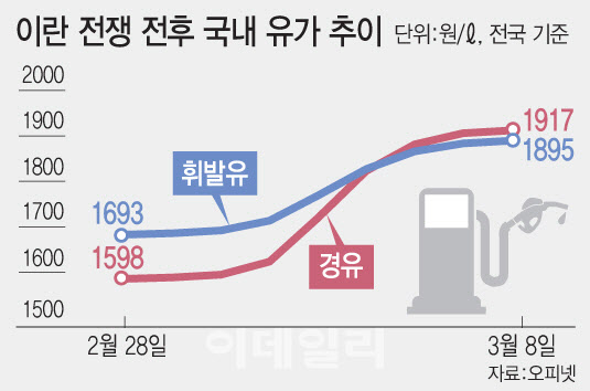 당장 국내 유가가 직격탄을 맞았다. 8일 한국석유공사 유가정보서비스 오피넷에 따르면 이날 전국 주유소 평균 휘발유 가격은 리터당 1894.86원으로 전날보다 5.46원 올랐다. 휘발유 가격보다 높은 수준을 유지하고 있는 경유는 1917.34원으로 6.79원 상승했다. 한국도 원유 수입 의존도가 높은 구조여서 유가 상승이 곧바로 물가와 내수에 부담으로 이어질 수 있다. 현대경제연구원은 국제유가가 연평균 배럴당 80달러 수준만 유지돼도 소비자물가 상승률이 0.4%포인트 높아질 수 있다고 분석했다. 유가가 100달러까지 오르면 물가 상승률은 1.1%포인트까지 상승한다고 예상했다. 호르무즈 해협 봉쇄가 장기화하는 ‘오일 쇼크’ 시나리오 하에서는 유가가 배럴당 150달러 이상으로 치솟을 것으로 전망했다. 이때에는 성장률이 최소 0.8%포인트 하락하고 소비자물가상승률은 2.9%포인트 폭등할 것으로 내다봤다.