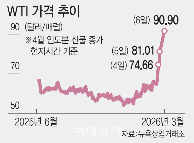 [뉴욕=이데일리 김상윤 특파원 이정윤 기자] 이란전이 장기화 조짐을 보이면서 국제유가가 급등하는 가운데 글로벌 경제에 스태그플레이션(경기 둔화 속 물가 상승)이 현실화하고 있다. 우리나라도 물가 급등과 소비 심리 위축 우려로 올해 2% 경제성장률 달성에 ‘빨간불’이 켜졌다. 현재 한국과 글로벌 경제를 흔들고 있는 가장 큰 요인은 국제유가 급등이다. 6일(현지시간) 브렌트유 선물 가격은 배럴당 92.69달러에 거래를 마쳤고 서부텍사스산 원유(WTI) 선물(4월 인도분)도 배럴당 90.90달러에 마감했다. 브렌트유가 종가 기준 90달러를 넘어선 것은 2023년 9월 이후 처음이다.