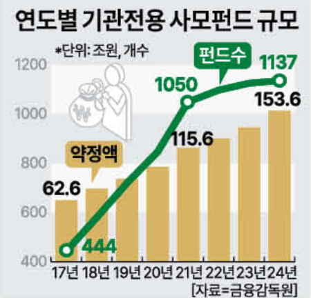 실제로 국내 PEF는 2004년 도입 이후 양적·질적으로 빠르게 성장하면서 자본시장 활성화와 산업재편에 기여해왔다. 지난해 말 토종 PEF의 출자 약정액은 도입 초기 대비 340배, 운용사 수는 10배 이상 늘었다. 굵직한 M&A도 PEF가 주도했다. 베인앤컴퍼니에 따르면 지난해 국내 사모펀드 주도 인수합병 시장 규모는 약 204억 달러로 전년 대비 약 20% 증가했다. 다만 최근 들어 PEF의 구조적 한계와 리스크도 늘어나고 있다. 투자 회수 기간이 길어지고 시장 내 쏠림 현상이 심화되는 추세다.
