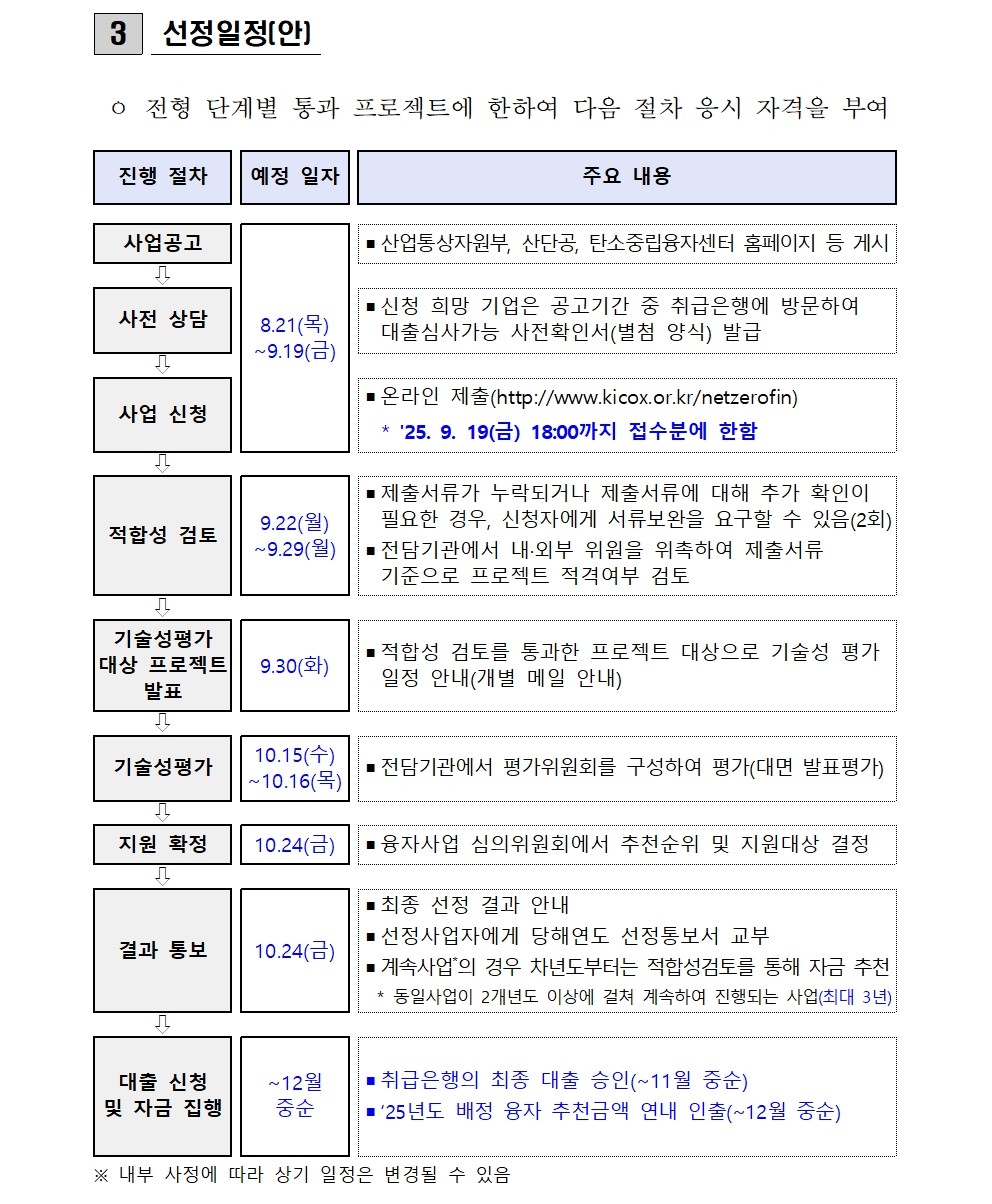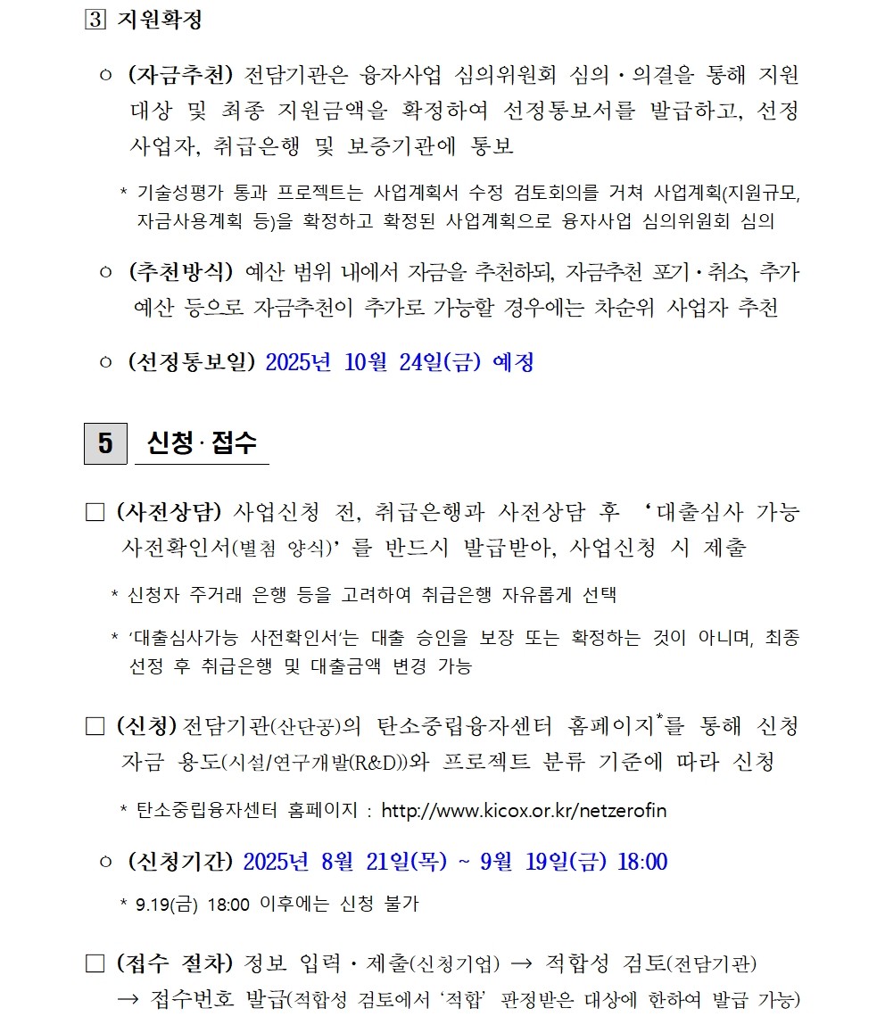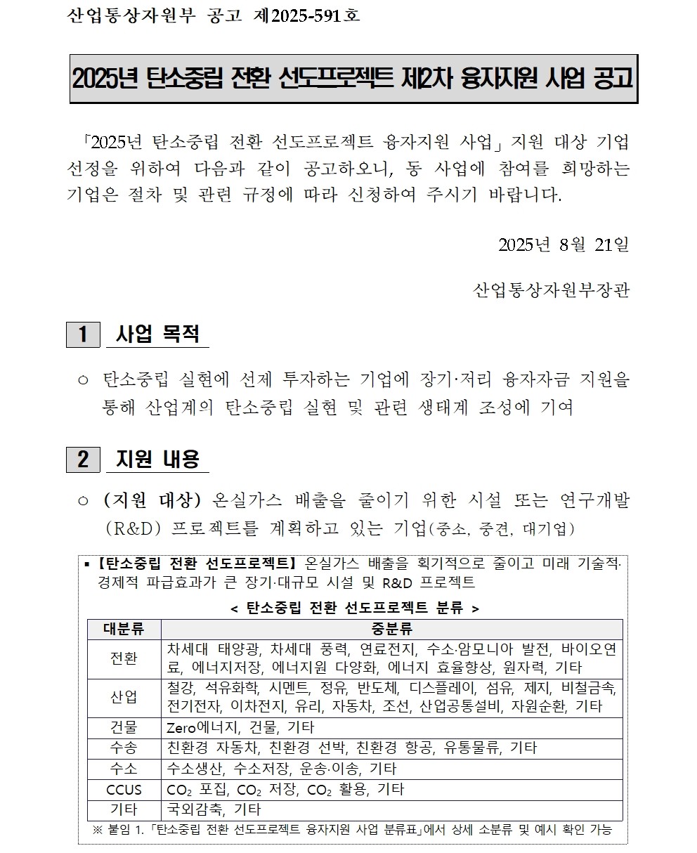 「2025년 탄소중립 전환 선도프로젝트 융자지원 사업」지원 대상 기업선정을 위하여 다음과 같이 공고하오니, 동 사업에 참여를 희망하는기업은 절차 및 관련 규정에 따라 신청하여 주시기 바랍니다.