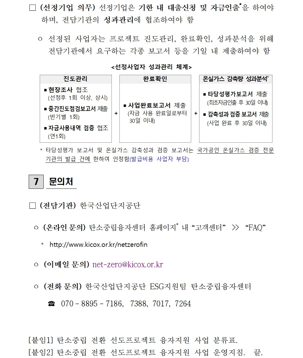 한국산업단지공단 ESG지원팀 탄소중립융자센터 (070-8895-7186, 7388, 7017, 7264 / net-zero@kicox.or.kr)