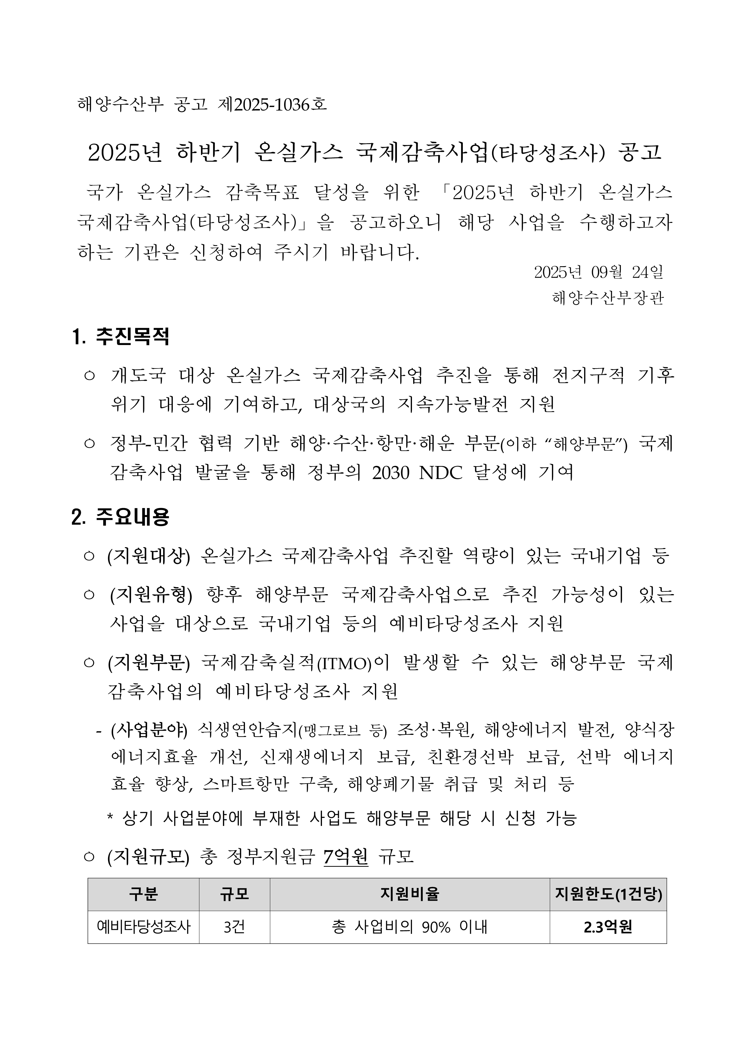 2025년 하반기 온실가스 국제감축사업(타당성조사) 공고