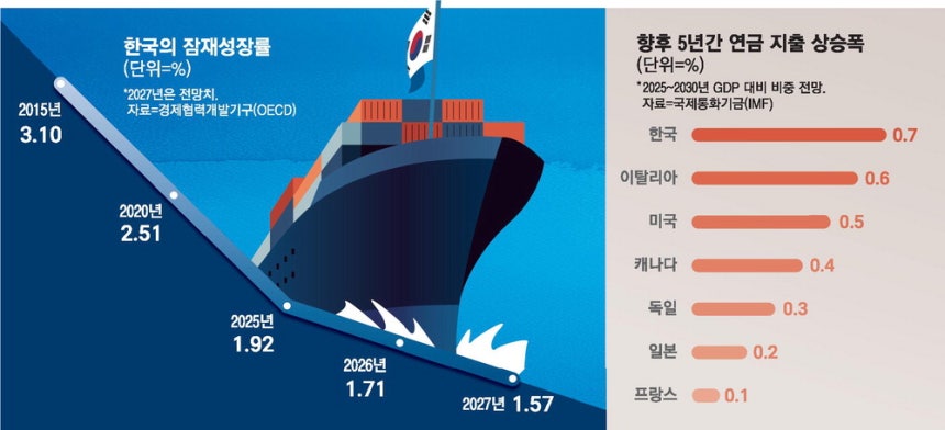 하지만 문제는 고령화에 따른 재정 부담 증가 속도가 가파르다는 데 있다. 국제통화기금(IMF) 재정 모니터 보고서에 따르면 한국 연금 지출은 2025년부터 2030년까지 GDP 대비 0.7% 증가해 주요 20개국(G20) 가운데 가장 빠른 상승률을 기록할 예정이다. 미국 0.5%, 독일 0.3%, 일본 0.2%보다 높은 수준이다. 이는 성장 기반이 약화하는 상황에서 복지 지출만 빠르게 늘어나는 '구조적 불균형'을 일으킨다.